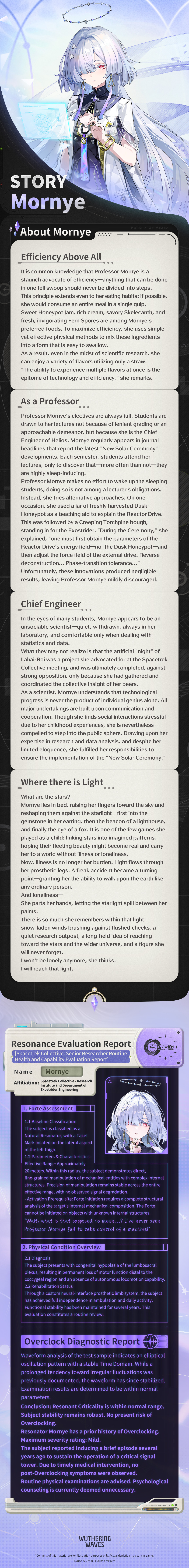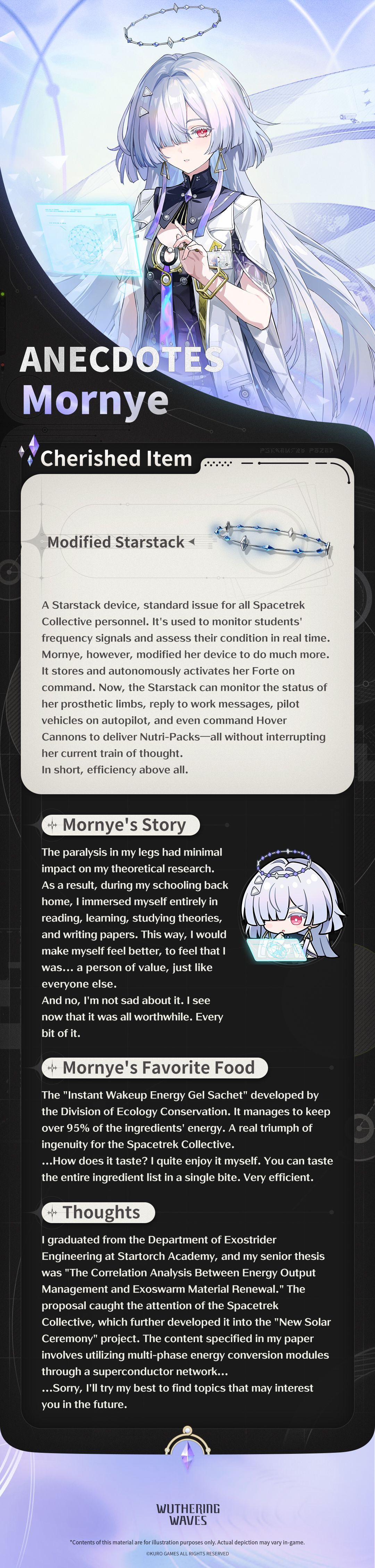+ "I am Mornye, Research Institute engineer and professor at Startorch Academy. Please, let me know when my expertise can be of service."— Mornye +