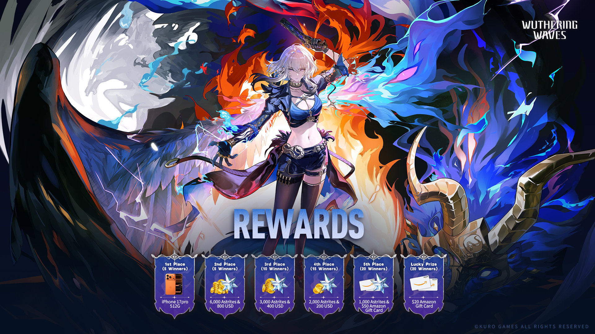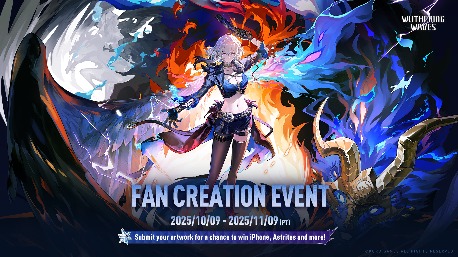 +Wuthering Waves Fan Creation Event "Dawn Breaks on Dark Tides" is now live! Post your work with hashtags #WutheringWaves and #WuWaFanart on X (Twitter)/Instagram/Facebook and fill out the form for a chance to win iPhone 17 Pro 512GB, Astrites and more!