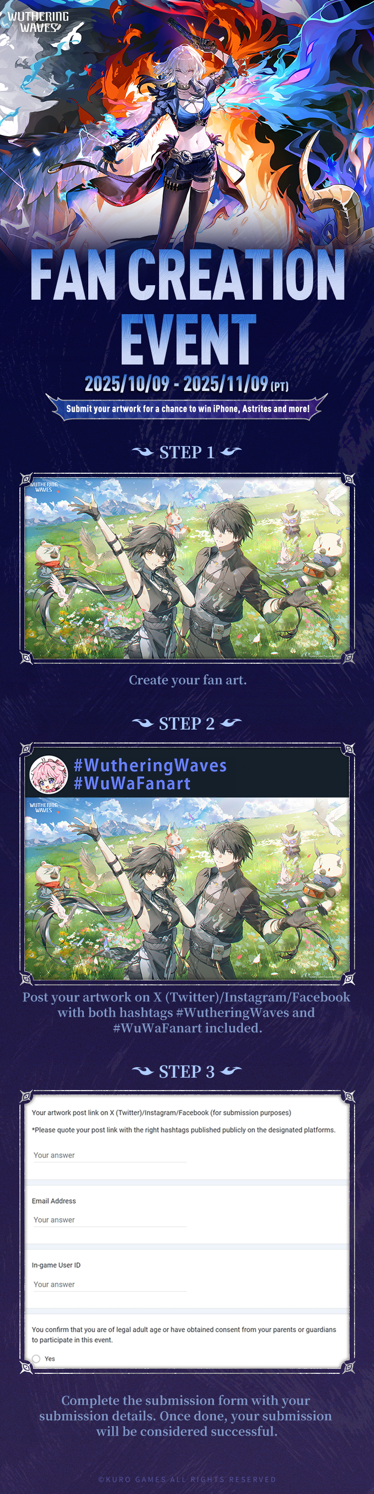 +By participating in the event, you grant KURO GAMES the right to freely republish your submitted content on the internet and social media platforms, with appropriate credit given to the creator. No additional notice will be provided prior to publication.