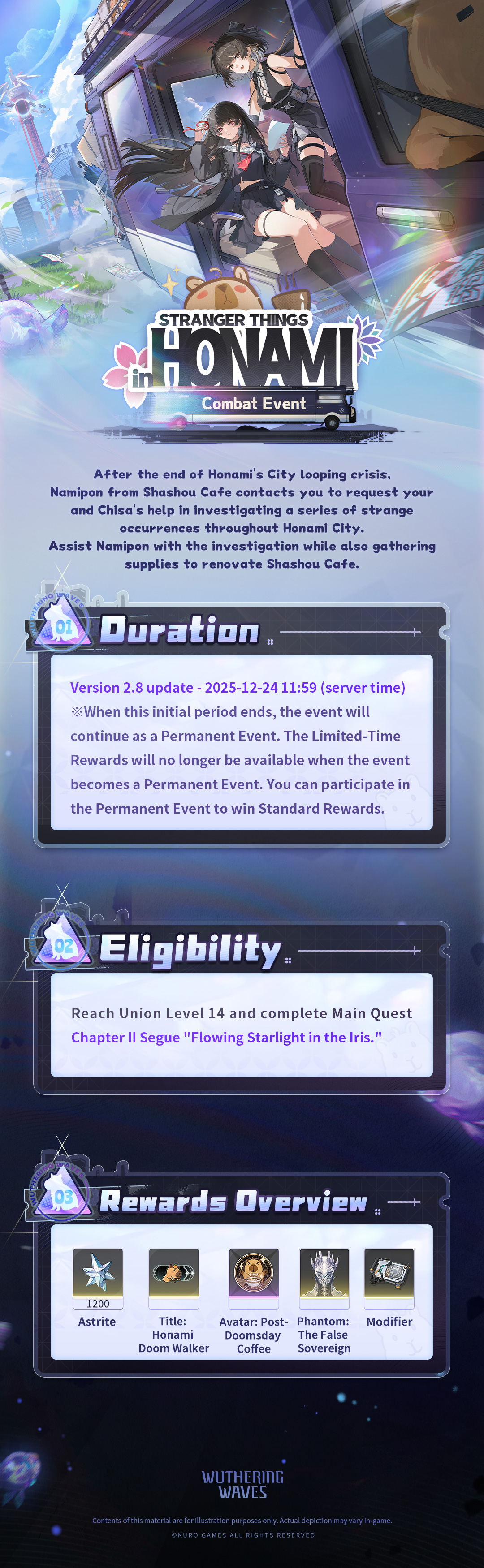 ※Partipate in the combat event "Stranger Things in Honami" to win Phantom: The False Sovereign (Phantom Echo), Post-Doomsday Coffee (Avatar), Honami Doom Walker (Title).