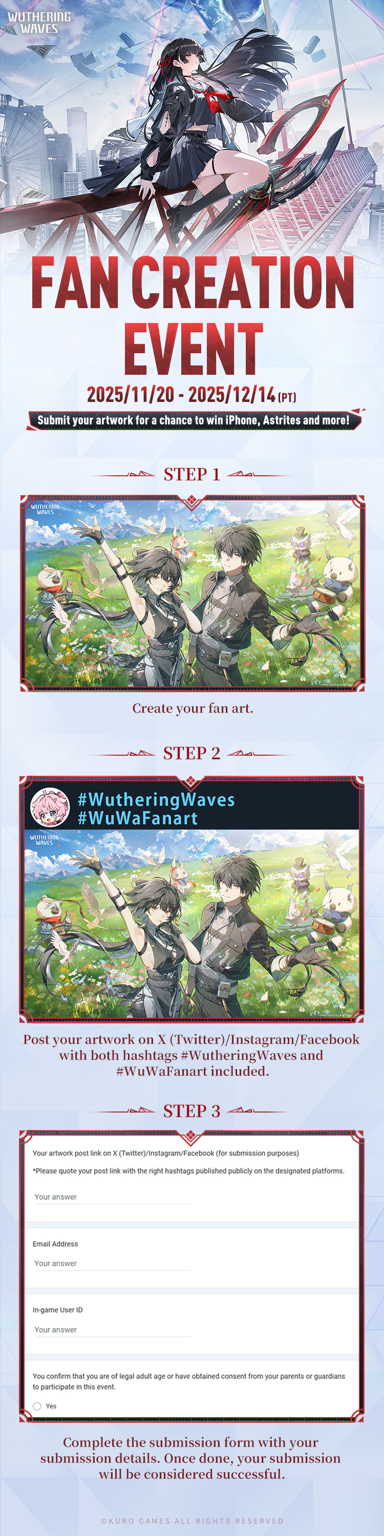 By participating in the event, you grant KURO GAMES the right to freely republish your submitted content on the internet and social media platforms, with appropriate credit given to the creator. No additional notice will be provided prior to publication.